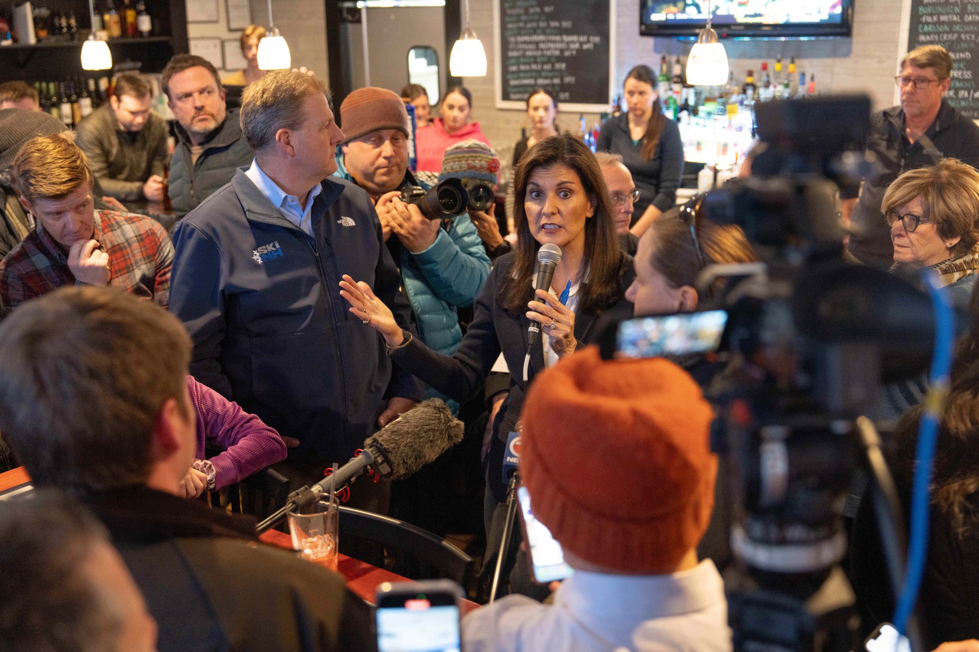 尼基·黑利(Nikki Haley)在新罕布什尔州汉普顿Grill 603举行的竞选活动上发言,时间为1月19日。