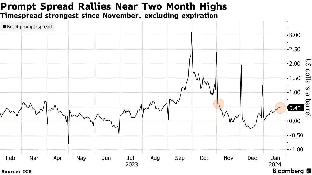 全球基准布伦特原油当月期货价格比下一个合约高出45美分,接近自去年11月以来的最高水平,不包括到期日。这个指标被称为即期价差,是供需的关键晴雨表,受到地缘政治风险上升的支撑,尽管当月价格仍然保持在区间内。