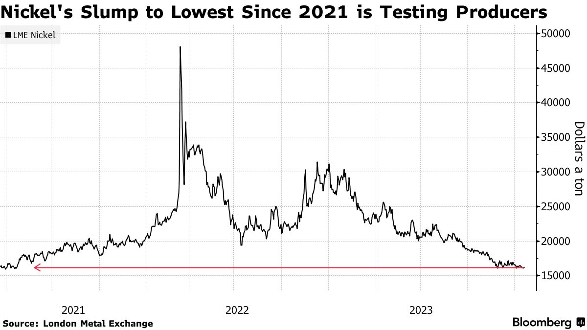 过去两年印尼大量新增供应的涌入压倒了需求,而此时金属市场正面临全球经济的低迷压力。对于镍来说,电动汽车行业需求增长疲软也是一个阻力,价格最近接近每吨16000美元,接近自2021年以来的最低水平。