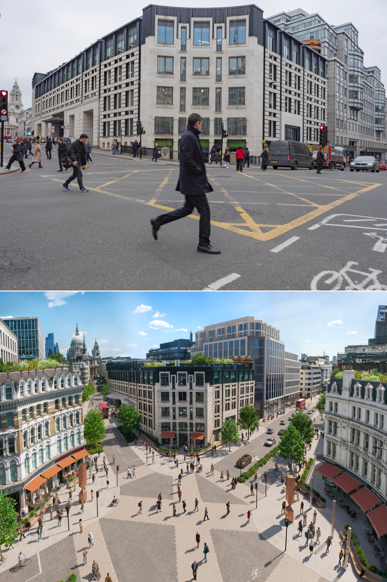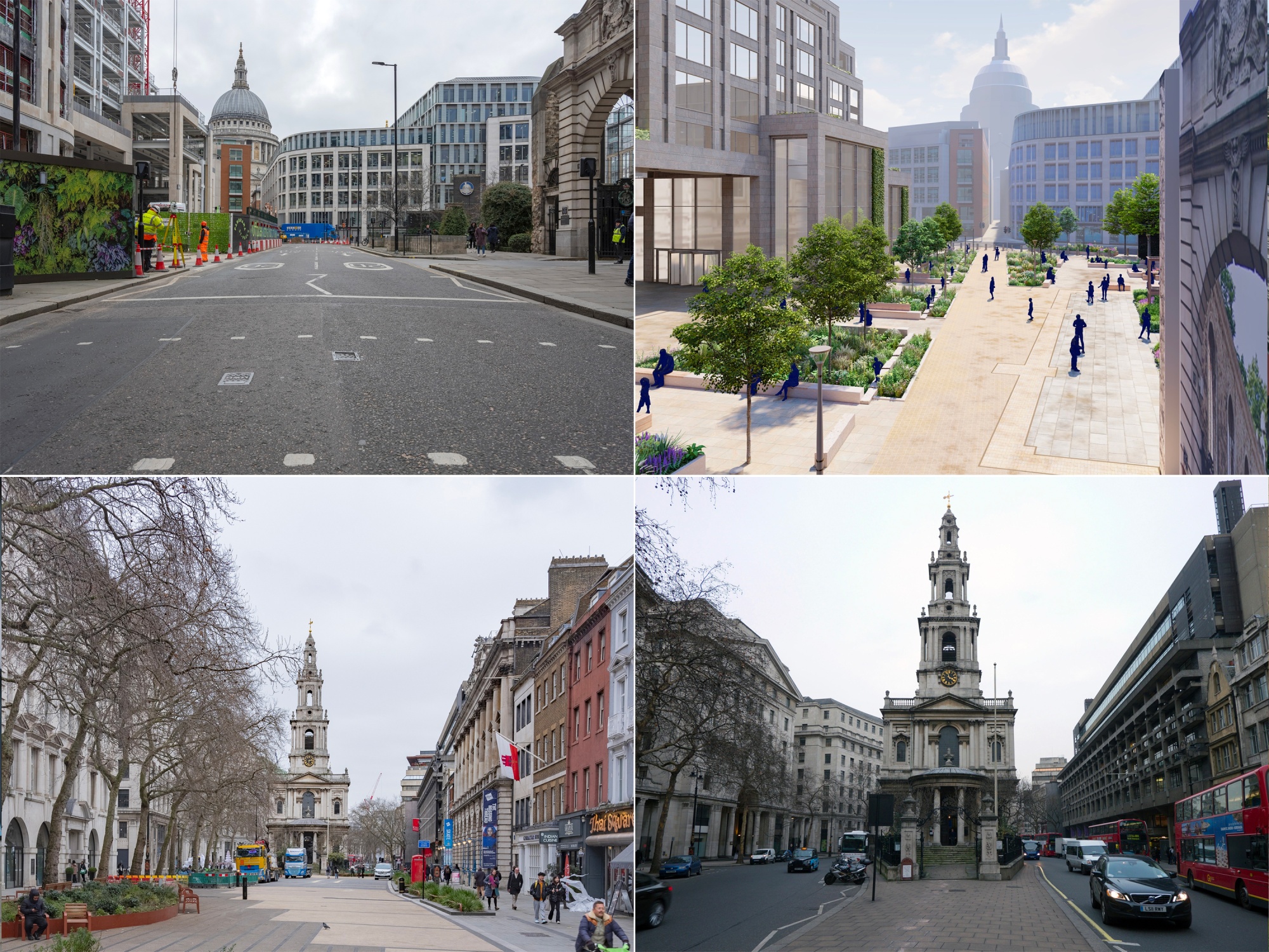 伦敦市公司提出的圣保罗大教堂北部的另一个项目将用一个公共广场取代宽阔的环形交叉路口。这个广场占地 3000 平方米,大约是足球场的一半大小,将取代上世纪 70 年代铺设的柏油路面,在明年完工时将成为伦敦市内最大的公共广场之一。从伦敦博物馆原址延伸至圣保罗大教堂,它将在巴比肯住宅区和该地区办公楼之间创造更宜人的步行环境,通往千禧桥、泰特现代美术馆和南岸等地。