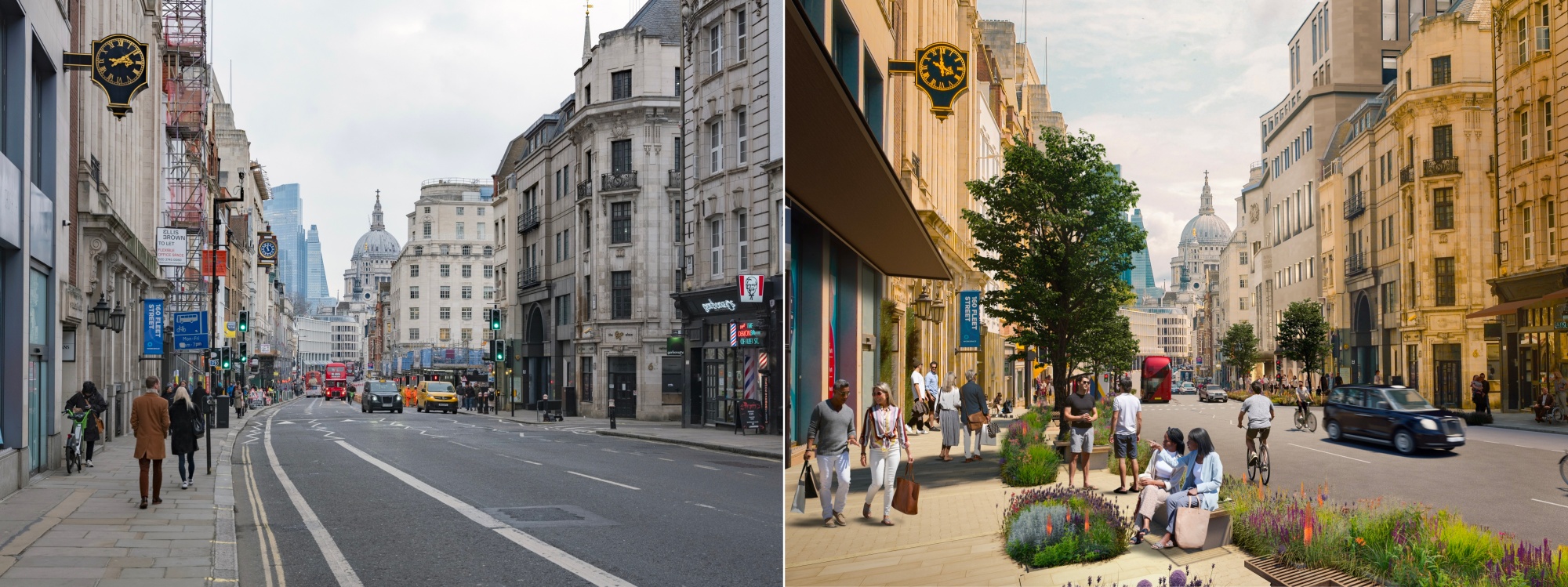上个月,根斯勒和 Fleet Street 商业团体宣布了一个价值数百万英镑的计划,将从道路上移除一条车道,为行人走道腾出空间。繁忙的十字路口将获得一个与牛津街口相似的同步过街设施。树木和小公园将被安置在加宽的人行道上,栏杆将被拆除。