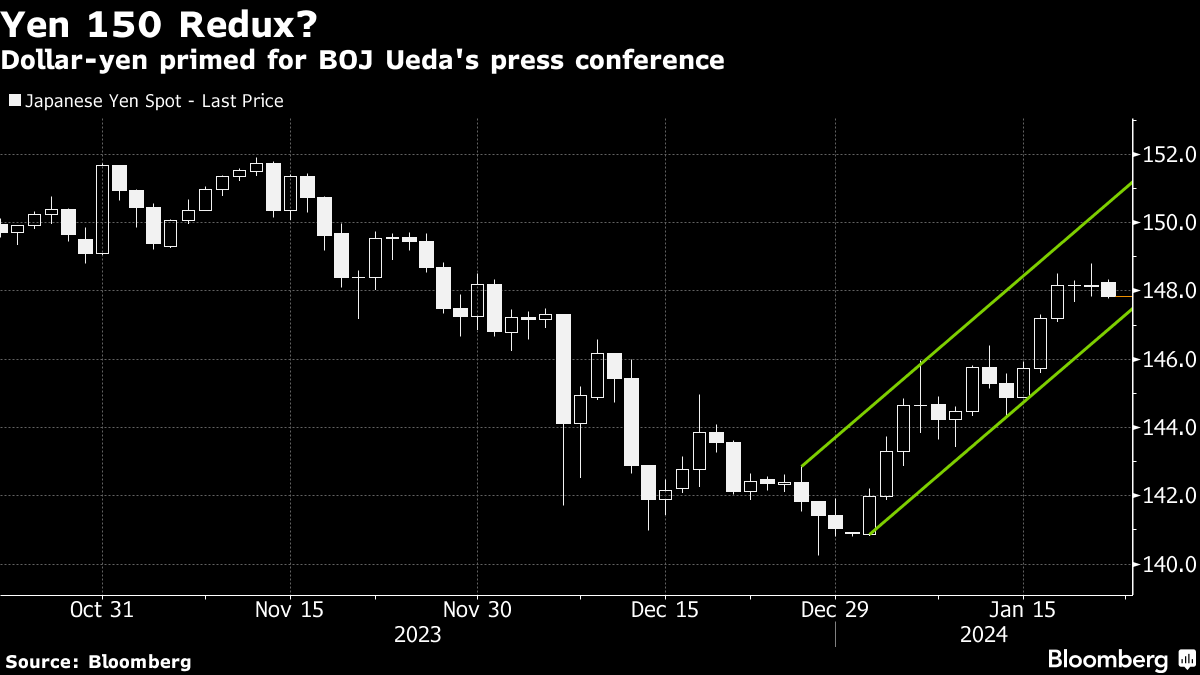本周美元/日元交易者的策略将围绕着周二的日本央行行长上田的新闻发布会展开。在12月的政策会议上,美元/日元的日内波动范围为271点,其中大部分涨幅发生在新闻发布会期间和之后。