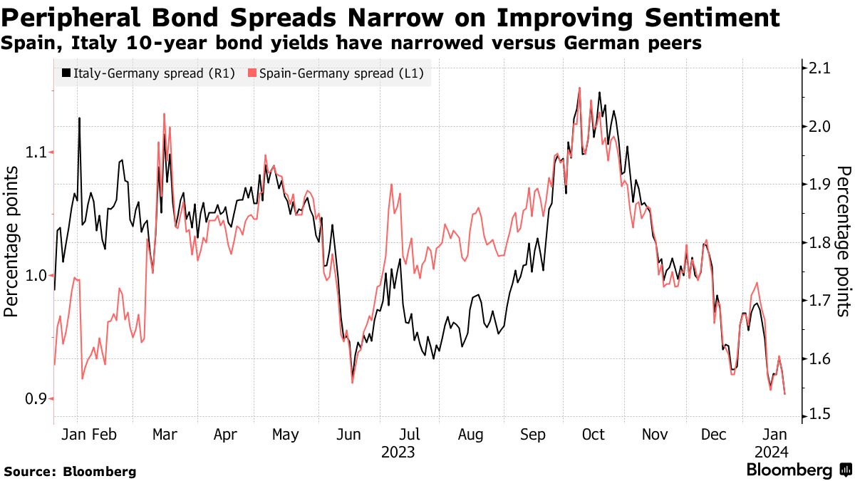自从它们的高企的收益率威胁到欧元的未来以来已经过去了十多年,这些国家被视为财政状况更加健全,越来越多的投资者愿意持有它们的债务。尽管今年欧洲央行的利率削减时间尚不明确,但政策宽松被视为不可避免,这缓解了对偿还大额债务的担忧。