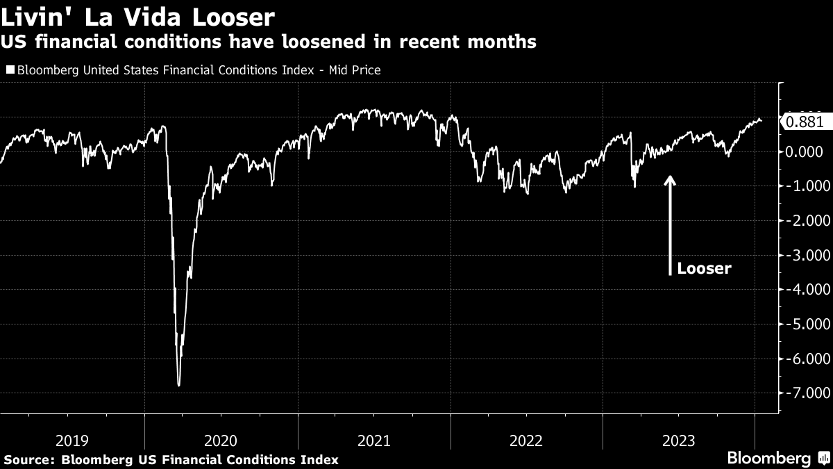 即使利率达到数十年来的最高水平,美国金融状况仍然相对宽松,因为股市飙升至历史新高,信贷利差也在收窄。