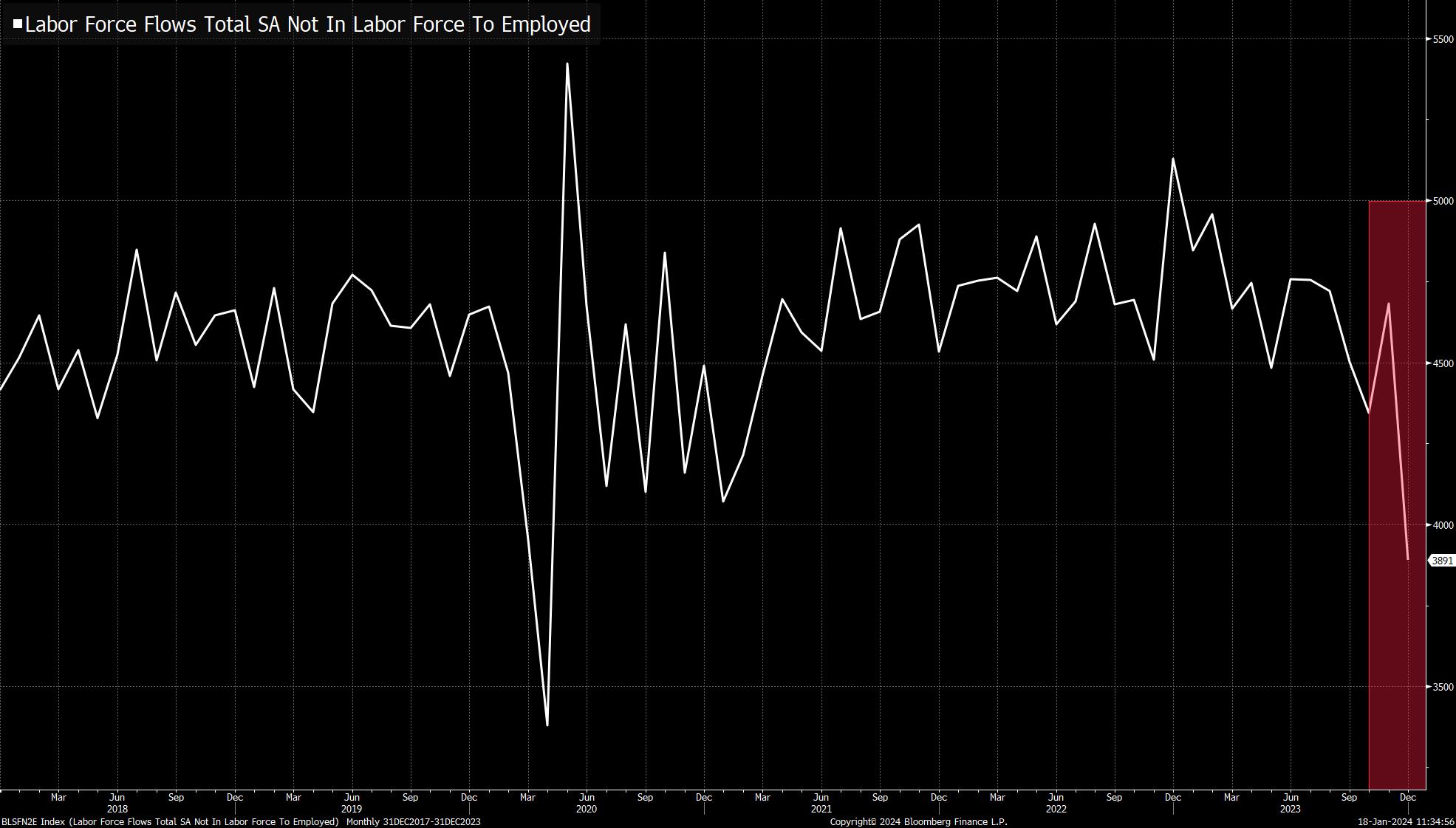 “对劳动力市场的仔细观察现在会表明,招聘刚刚停滞不前,” Cummins 说道。“如果不是参与度在上次报告中大幅下降 —— 下降了三个百分点 —— 失业率将会上升三个百分点,达到 4%。”与此同时,家庭调查数据显示,从劳动力外部进入就业的人数大幅下降,他说。
