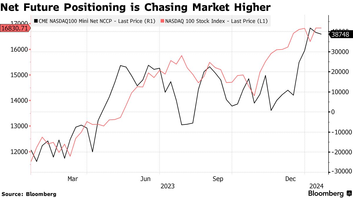 周五看涨期权交易量激增,表明投资者更多地追逐上涨,而纳斯达克100指数的净期货持仓在短短六周内从几乎持平变为显著做多。