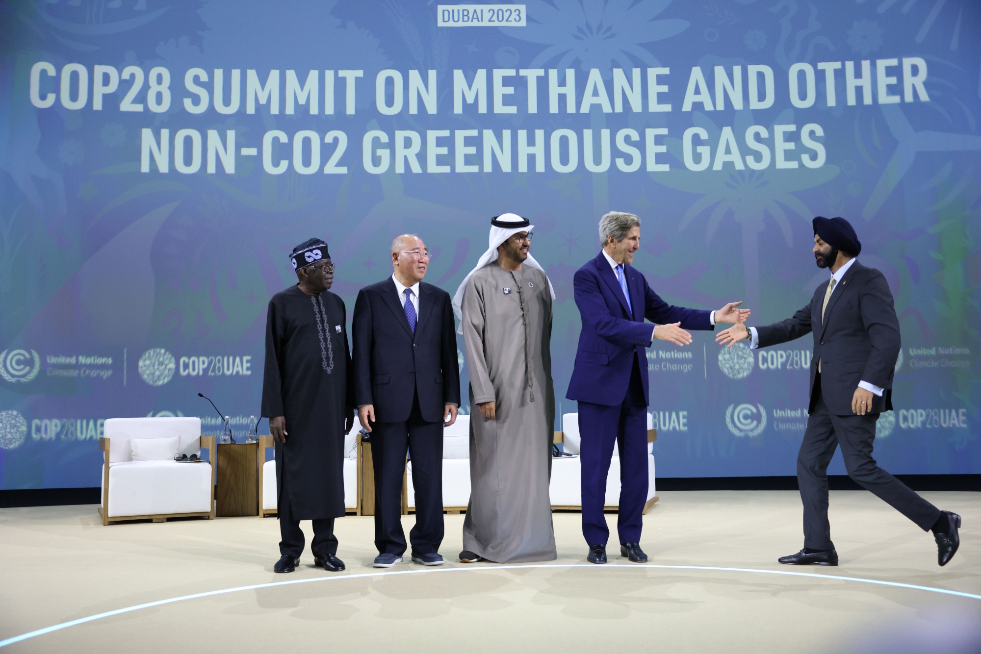 尼日利亚总统博拉·提努布、中国气候变化特使谢振华、阿布扎比国家石油公司首席执行官、COP28主席苏丹·艾哈迈德·阿尔贾贝尔、美国气候特使约翰·克里和世界银行集团总裁阿贾伊·班加在去年的COP28上。摄影师:Hollie Adams/Bloomberg### 各国可以采取什么措施来减少全球变暖?美国又有什么特别之处?
