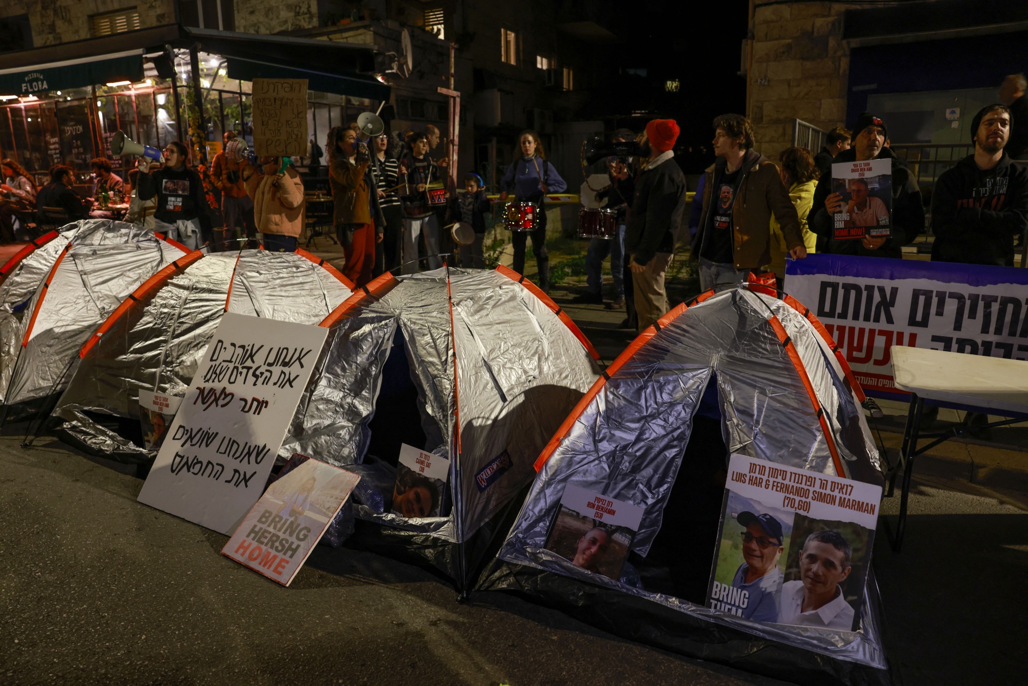 抗议者在耶路撒冷以色列总理官邸附近的帐篷后面站立,参加了由以色列在加沙被扣押人质的家人和支持者组织的集会。(法新社梅纳赫姆·卡哈纳/法新社通过盖蒂图片社拍摄)