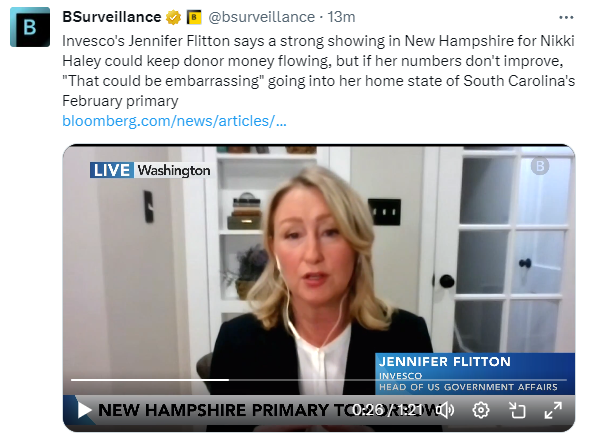 但是随着 Ron DeSantis 退出,如果尼基·黑利在新罕布什尔共和党初选中表现不佳,她是否有可能继续挑战唐纳德·特朗普?晨间,Invesco 的 Jennifer Flitton 提出并回答了这个问题:可能,但绝非易事。“如果她明天能在特朗普之后落后5个百分点,她可能会有一些势头,真正的支持和资金会持续流入,” Flitton 说。否则,她说,黑利在2月24日南卡罗来纳共和党初选中面临“尴尬”的失利风险 — 特朗普在那里领先很大,“你会看到一个更加传统的共和党基础。”