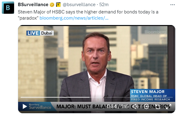 快进到今天:曲线正在重新走高,降级已经成为过去,而通缩论仍然站得住脚,Major说。是的,仍然有大量国债供应。但是,“它将进入一个更愿意购买的需求环境,”他说。