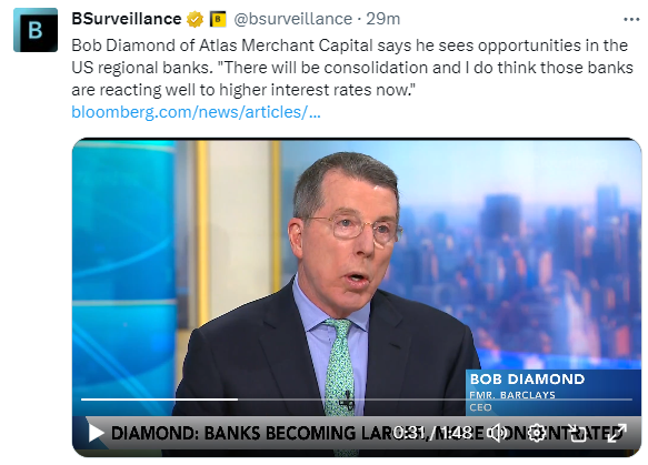 “我们认为地区银行将会有很好的投资机会。我们喜欢这个领域作为投资对象,” Diamond 说,他作为嘉宾主持加入了*《监控》*一个小时。他说,这些银行现在正在执行去年使它们步履维艰的高利率。“市场对危机已经过去感到更加放心了。”