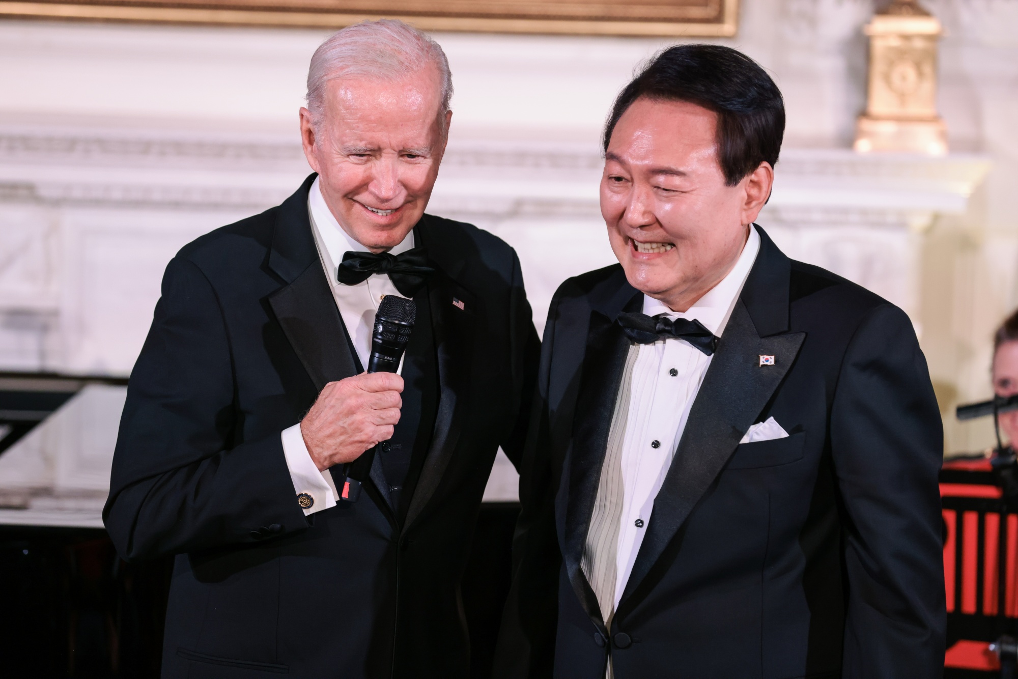 乔·拜登(左)和尹锡悦在2023年4月白宫的国宴上。摄影师:Oliver Contreras/Sipa/Bloomberg但是不能保证这些豁免将继续有效,特别是如果共和党领先者唐纳德·特朗普赢得11月的美国总统选举并重返白宫。