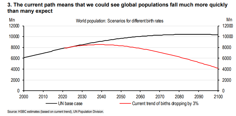 “人口结构就是命运”这句话被归因于法国“社会学之父”奥古斯特·孔特(也许有争议)。如果全球出生率继续以每年3%的速度下降,那么人口增长的前景必须发生根本性的变化。事实上,如果汇丰银行的计算是正确的,世界人口的峰值即将到来,本世纪的其余时间将会出现人口下降: