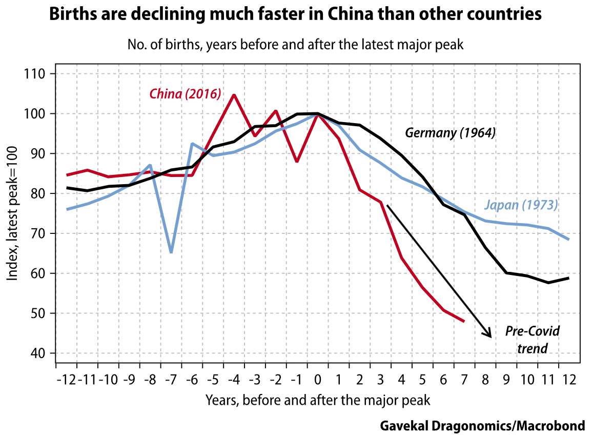 其他国家在过去也曾出现过出生率急剧下降的情况,尤其是日本,那里的出生率从1973年开始下降。随着那一代人开始进入育儿年龄,日本在2000年开始陷入长期的经济困境。但正如Cui所展示的,自2016年达到最高点以来,中国的下降速度要快得多: