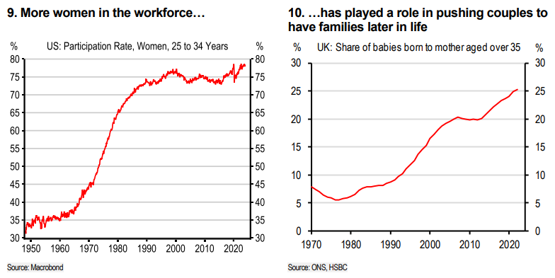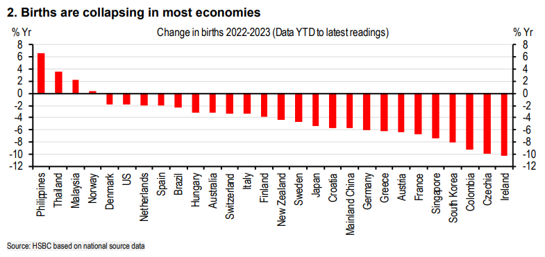 事实上,出生率的下降范围非常广泛,尽管在地理上有很大的差异。以下数据来自汇丰银行: