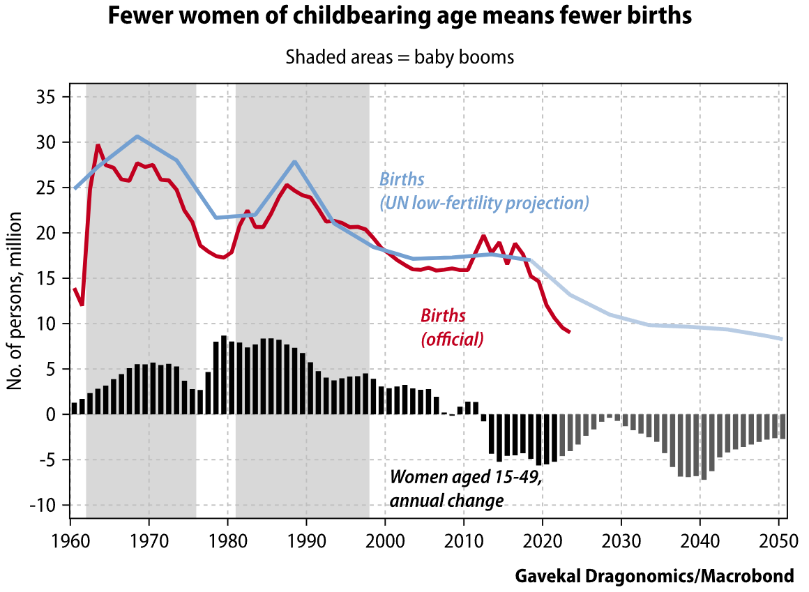 由于其庞大规模,以及之前采取的粗糙但有效的尝试来抑制出生率,中国的人口结构往往主导着人们的认知。正如Gavekal Dragonomics的Ernan Cui所展示的这张图表所示,中国的出生率下降速度远远快于最近的预测。育龄妇女数量的持续下降可能会进一步降低出生率: