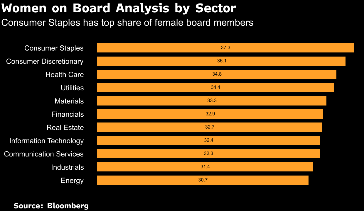 - 材料部门在女性董事数量上取得了净增长,空气产品和化学品公司和艺康公司的董事会各增加了一名女性董事。