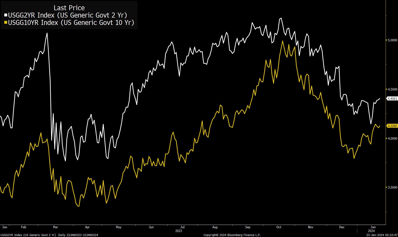 我们只是在谈论一个短时间段,但有趣的是,这些涨幅是在利率上升的情况下出现的。2年期回升至4.4%以上。自去年12月底以来,10年期收益率已经大幅反弹。