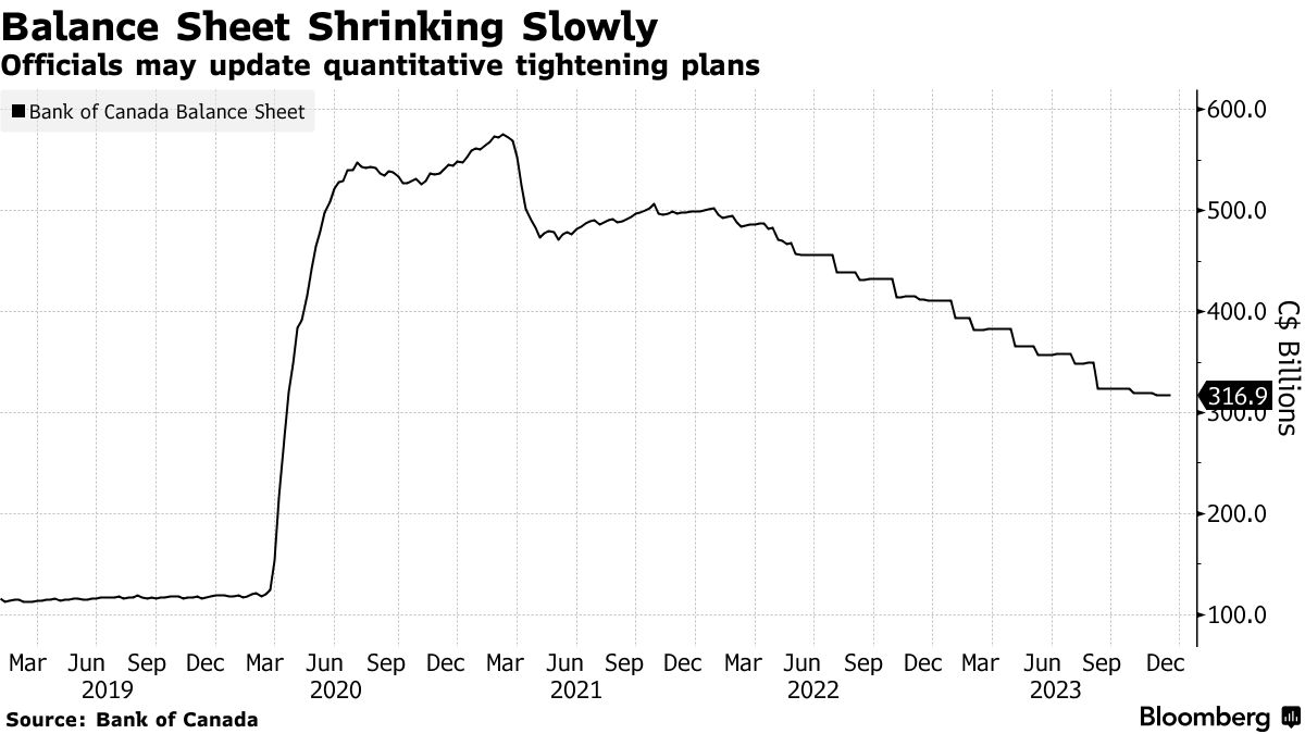 自2022年开始进行量化紧缩以来,资产已减少至约3170亿加元,但流动性压力促使一些分析师怀疑央行是否能够继续缩减其持有的资产,直到2024年底或2025年初,这是副行长托尼·格拉韦尔在去年三月提出的目标。