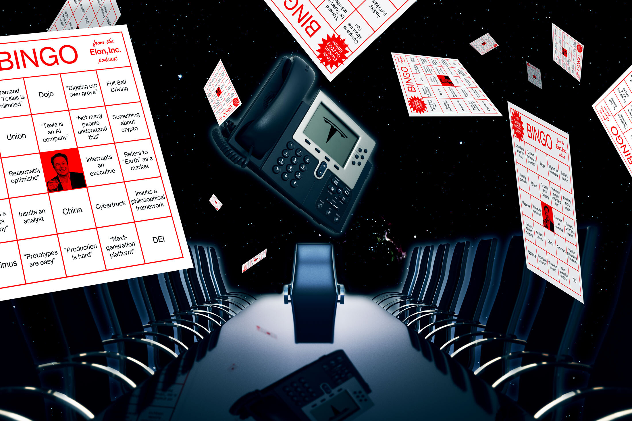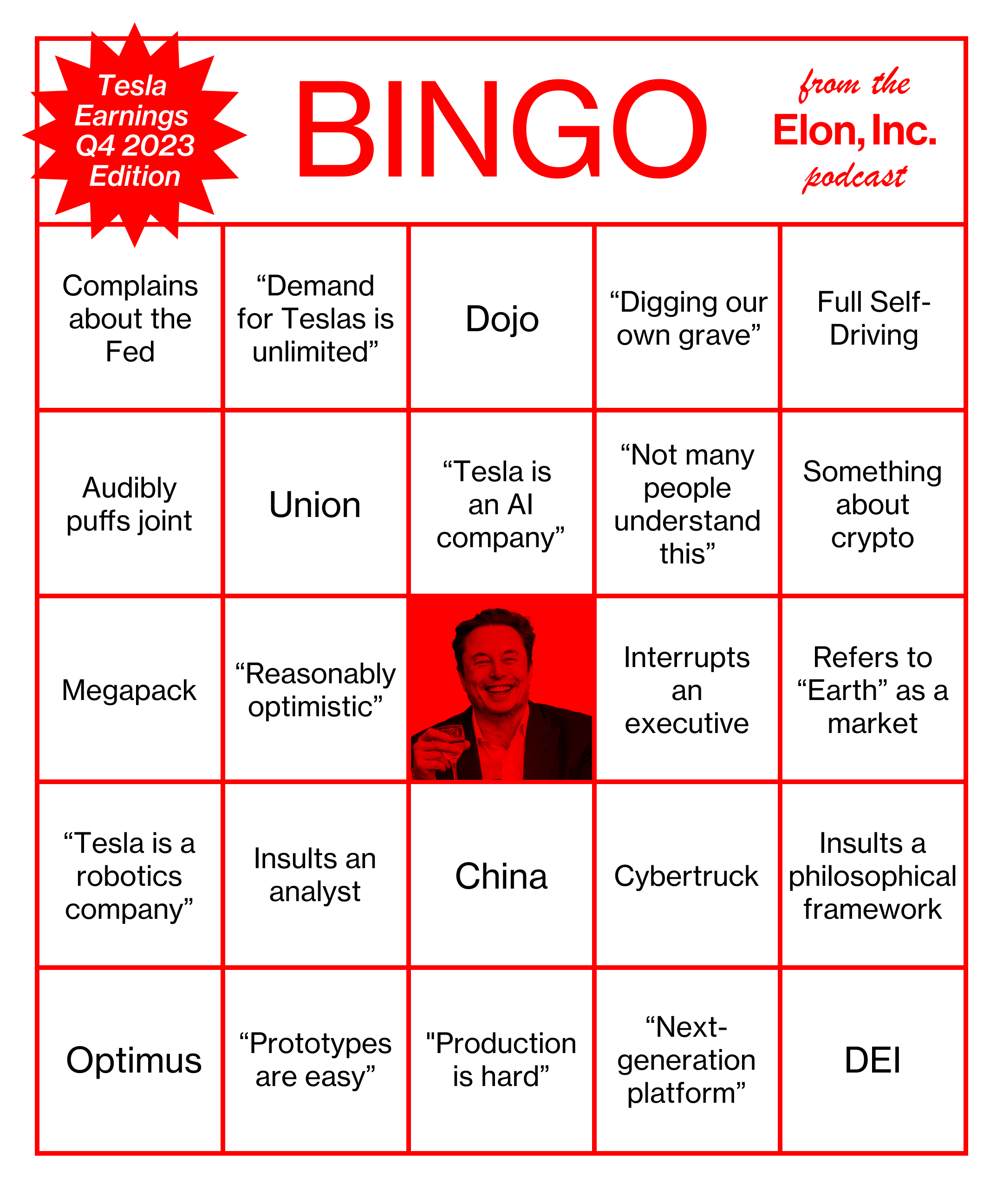 图片插图:731多年来,特斯拉的粉丝和评论家们都会在特斯拉的财报电话会议前制作模拟宾果卡。因此,为了纪念特斯拉下次的财报电话会议,该埃隆公司团队制作了自己的宾果游戏。在我们最新的节目中,我们预览了特斯拉第四季度的财报,并介绍了我们认为哪些马斯克用语会成为焦点。我们将在彭博终端和 彭博商业周刊 X的账号(@BW)上进行游戏。