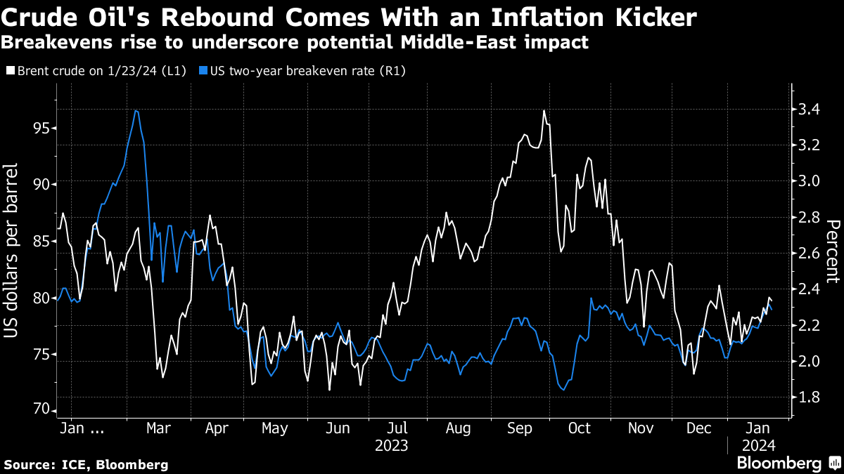 这些利率可能会在供应链适应的情况下回落,但原油价格的反弹更为稳定,即使运费下降,也有扩大的空间。这些变化在2024年初困扰债券市场的剧烈波动中有些被忽略了,但交易员对通胀的预期也在上升。两年期通胀预期利率——反映了对该期间内年均消费者价格涨幅的押注——达到了约2.3%。