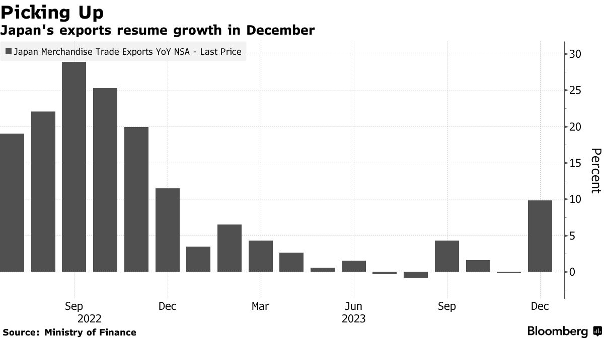 强劲反弹 | 日本上个月出口出现回升,随着对美国的出货量呈现两位数增长,对中国的出货量也是13个月来首次增长。财务省周三报告称,12月出口同比增长9.8%,为一年来最大涨幅,扭转了上个月0.2%的下滑。经济学家此前预测增长9.2%。这一数据将提振日本经济在10-12月季度重返增长的前景。