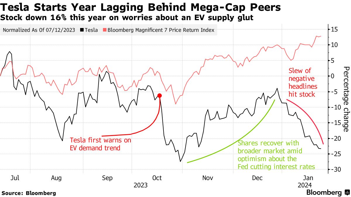 特斯拉的股票交易价格为未来收益的54倍,几乎是彭博大7价格回报指数的平均28倍。这是在股票在2023年结束时上涨了100%以上,从前一年的一波猛烈的下跌中反弹,这一策略是通过疯狂降低车辆价格来暂时提振需求。特斯拉与其他科技巨头的关联也在投资者对人工智能投资狂潮中帮助了股价。