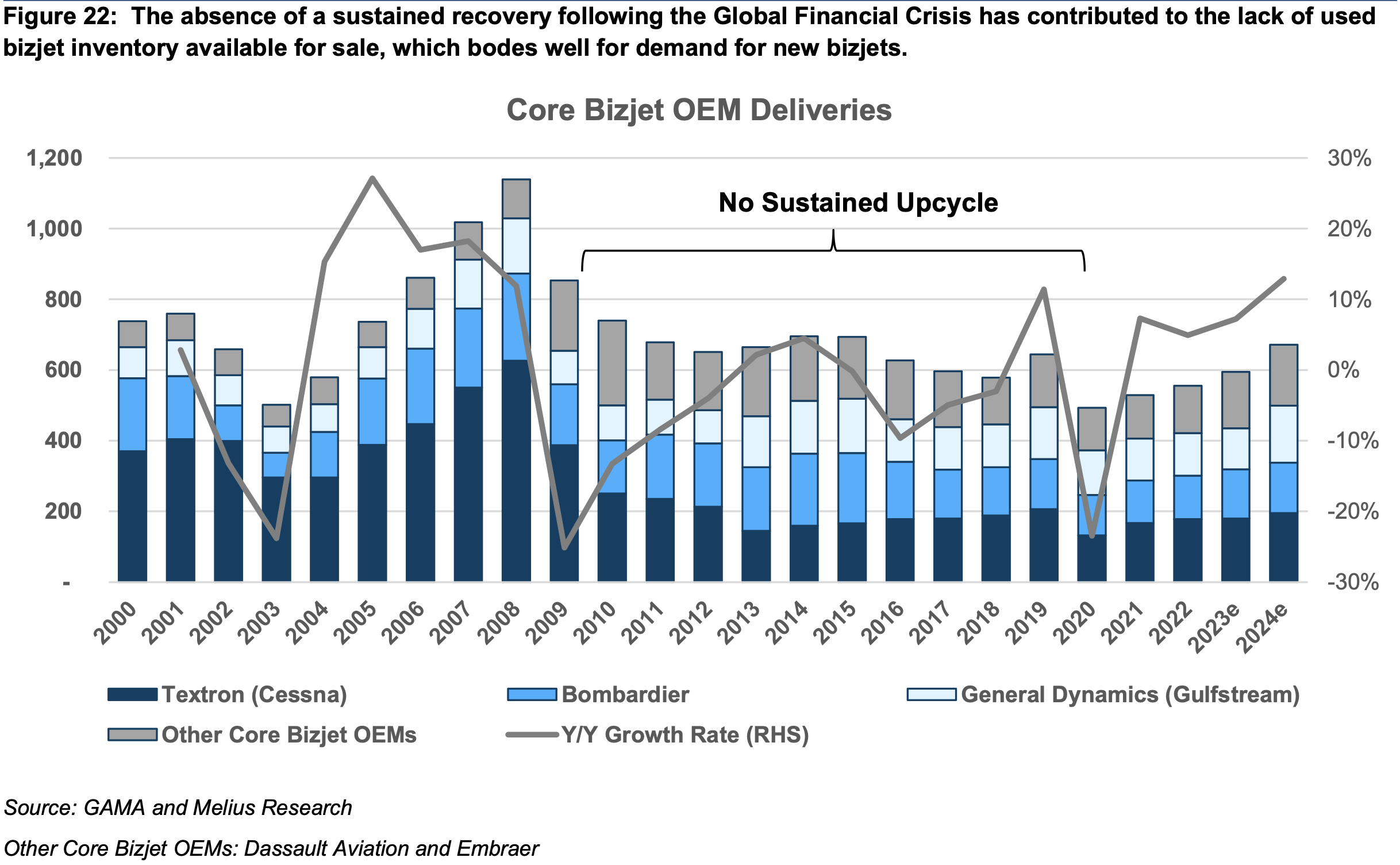 商务飞机市场面临的最大风险可能来自私人飞机出租服务运营商,他们的财务挑战可能会导致额外的库存释放。2021年与一家空白支票公司合并的私人飞机服务运营商Wheels Up Experience Inc.在去年在获得一笔拯救融资包之前,接近破产。这笔融资来自包括Knighthead Capital Management、Certares Management和Delta Air Lines Inc.在内的一家投资者财团。竞争对手VistaJet的债券最近面临压力,因为其高额亏损和债务问题,这一点被《华尔街日报》所记录。二手飞机的供应量已经开始从历史低位上升,但目前大多数可用的飞机都相当老旧,并且几乎没有风险会蚕食对新型号的需求,特雷克斯特龙表示。在全球金融危机之后,制造商仍在努力赶上私人飞机销售的长期低迷,这也有助于保持供应量受控制,Melius Research分析师罗伯特·斯平加恩本月在一份报告中写道。