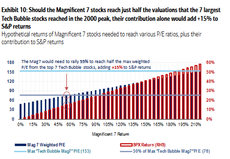 但与上世纪90年代末的泡沫时代相比,估值相对较低。如果它们只达到当时七家最大科技股的最高市盈率的一半,今天所谓的“七巨头”股票将每只股票涨幅需达到55%,根据美国银行公司包括本杰明·鲍勒在内的策略师最近的分析,这将相当于标普500指数的涨幅15%,其他条件不变。