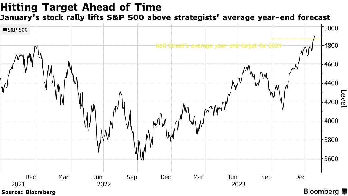 在华尔街预测师之间普遍缺乏热情的情况下,股市很快就超过了他们的目标。根据去年12月的预测,标普500指数在2024年将上涨1.3%。这是自1999年彭博开始跟踪数据以来最不乐观的一年展望。