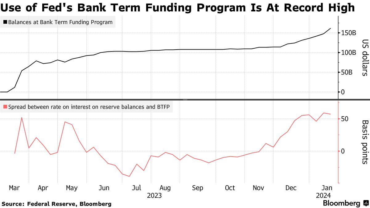 联邦储备数据显示,截至1月17日周三,BTFP的借款额创下了创纪录的1620亿美元。与之前的1470亿美元的历史最高水平相比。