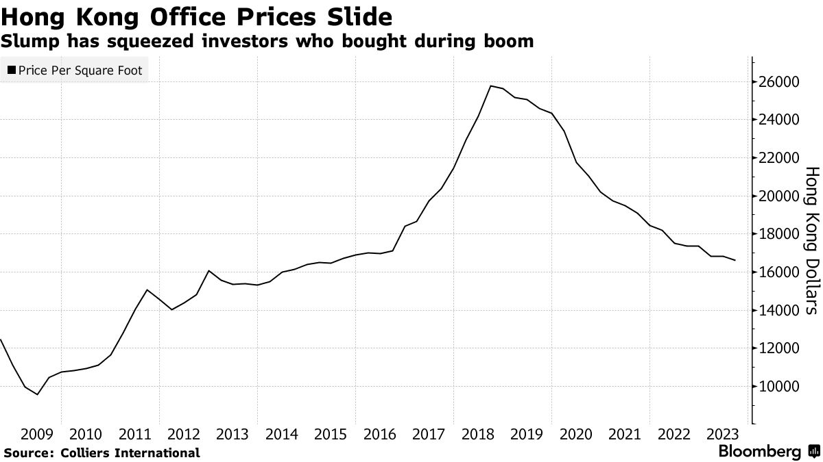 现在在香港出售办公楼物业并不容易,随着租金下跌和金融中心失去光彩,空间也在空置。即使办公楼价格从2018年的峰值下跌了35%,买家也难以觅得。