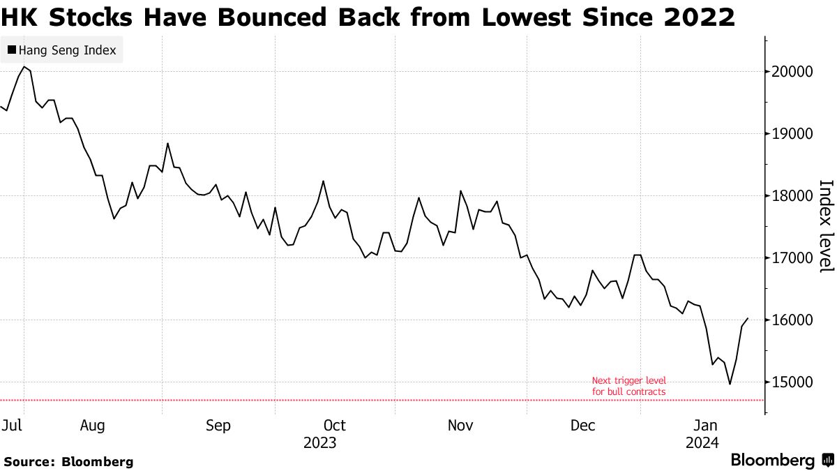 交易所数据显示,从1月17日至22日,数百份多数看涨合约的交易被终止,清盘了投资者的资金,并引发了银行纷纷平仓对冲头寸。大部分损失发生在1月17日,当时恒生指数自2022年10月以来出现了最大跌幅。
