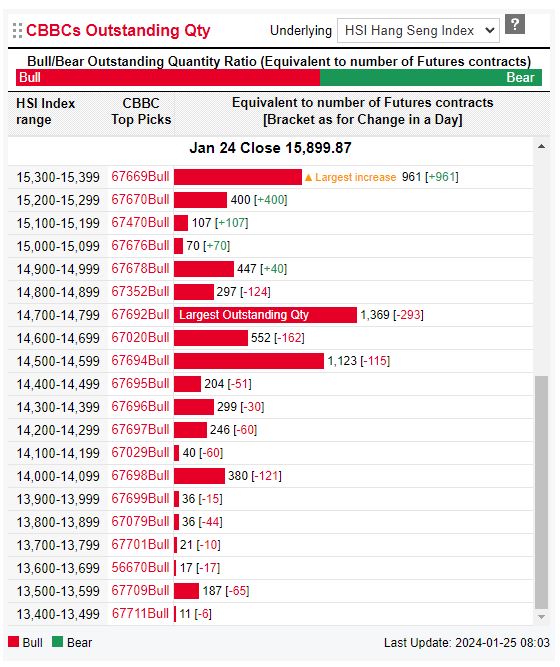 下一个关键触发水平将是14,700点,根据法国兴业银行的数据,截至周四早些时候,有1,369份未平仓的恒生指数牛市合约与之相关数据。这比当前水平低约9%。