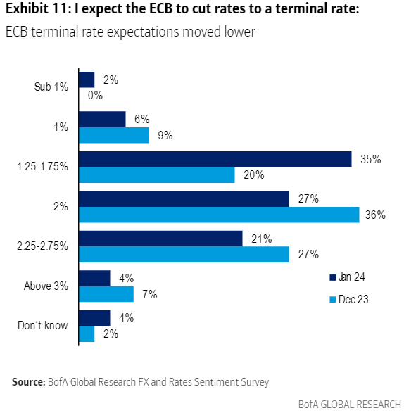 周三,加拿大银行按预期维持利率不变,但通过删除先前声明中的一句话,暗示着它正在转向降息。这句话曾表示它仍准备再次加息。周四早上是欧洲央行,一般预计它将在今年开始放松,但比美联储晚一点。它一直受到较高的通胀和比美国更糟糕的失业率的困扰,使得它的判断变得困难。但市场越来越有信心,利率最终将大幅下降,正如最新的美国银行基金经理调查所显示的:
