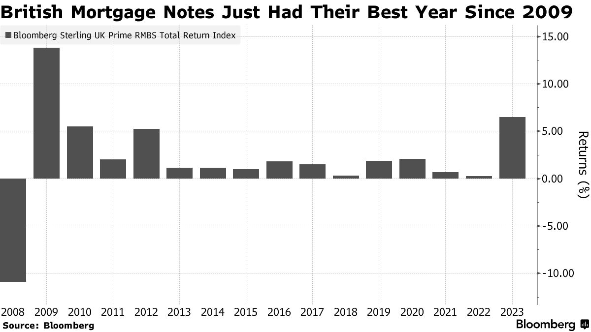 根据彭博编制的数据,英国的优质住宅抵押贷款支持证券去年的回报率超过了6%,达到了2009年以来的最高水平,即使借款成本大幅上升。根据巴克莱银行的数据,2023年发行的票据价值相当于90亿欧元(98亿美元),是前一年的两倍多,也是自2019年以来的最高水平。