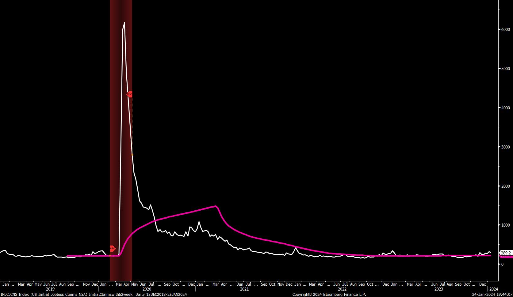 今天美国东部时间早上8:30我们将得到最新的初请失业救济数据,预期值为20万,按历史标准来看非常低。我不时发布的一个指标是非季节性调整后的52周移动平均失业救济数据。