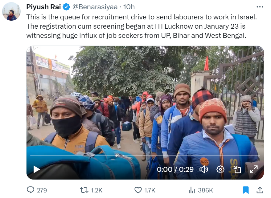 在过去的一周里,印度北部邦特拉普拉德和哈里亚纳邦的数千名劳工在寒冷的天气中排队前往以色列工作。