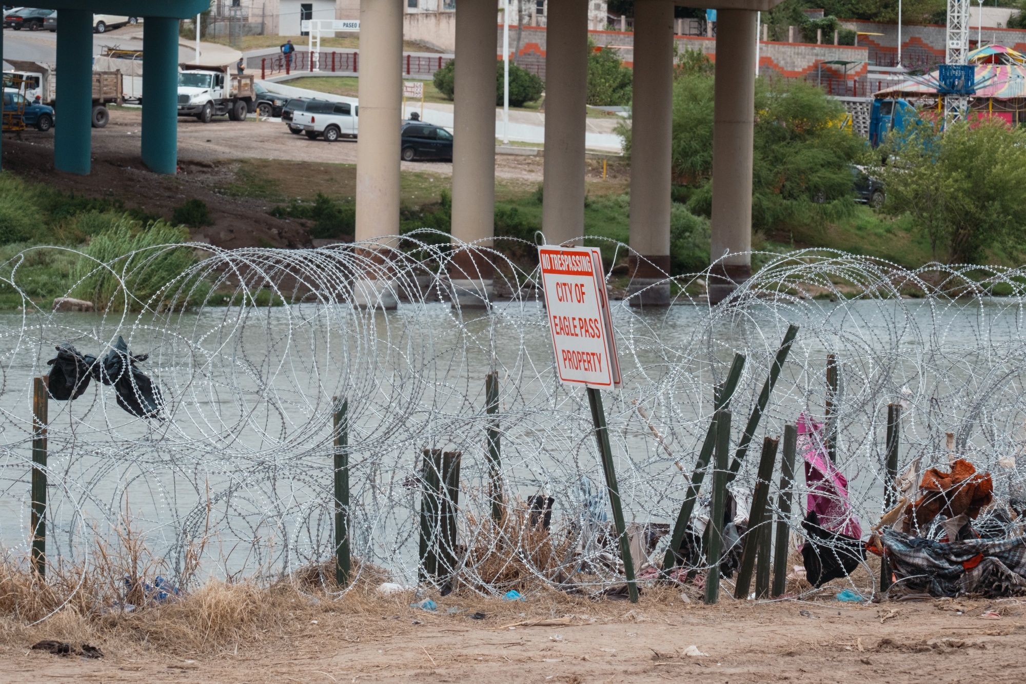 德克萨斯州伊格尔帕斯(Eagle Pass)的里约格兰德河沿岸覆盖着一层剃刀铁丝。