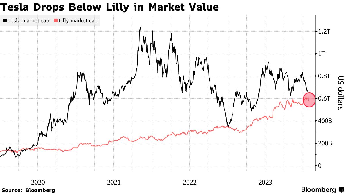 礼来的市值在2023年初曾一度超过特斯拉,尽管距离这家制药公司的市值稳定地超过这家电动汽车公司已经有大约四年的时间。