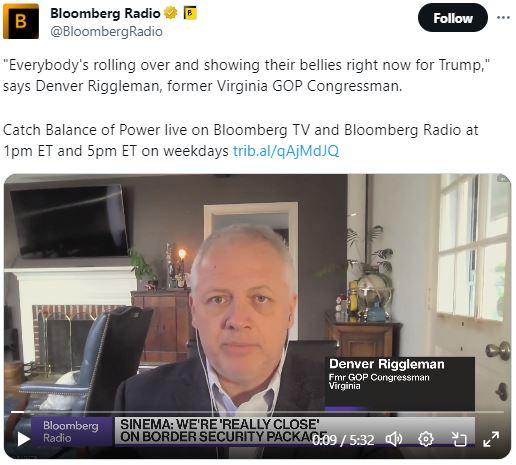 今天在彭博电视台的新节目权力平衡早间版中,主持人乔·马修和凯莉·莱因兹采访了前共和党众议员丹佛·里格尔曼,谈到特朗普在共和党中的主导地位。