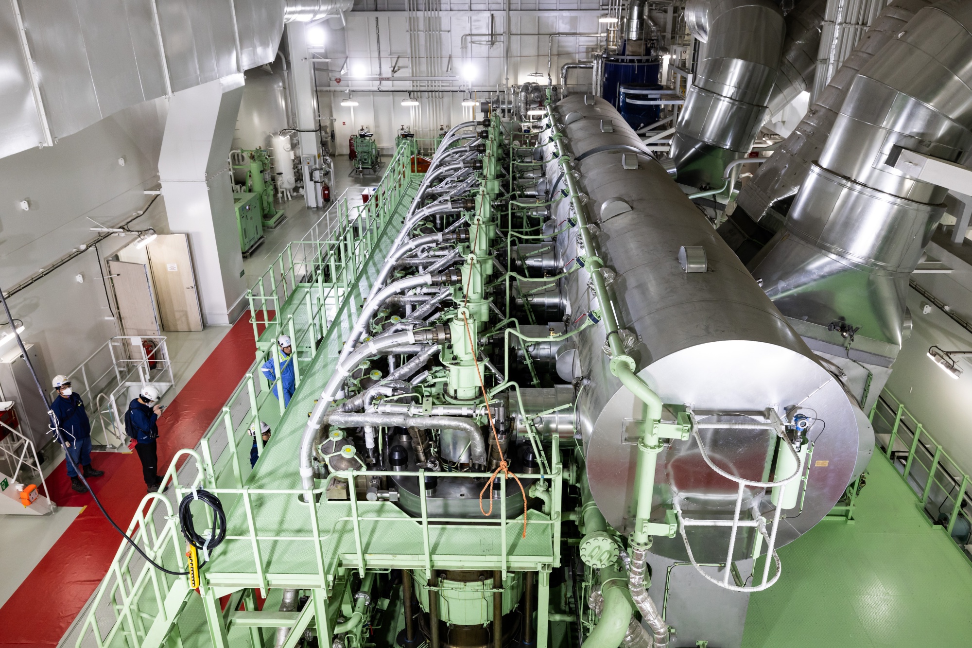 安妮·马士基内部的引擎室。摄影师:SeongJoon Cho/Bloomberg马士基计划到2027年拥有25艘能够使用所谓的绿色甲醇运行的船只 — 燃料,这种燃料要么是由生物质制成,比如固体市政废物,要么是由氢和二氧化碳制成 — 马士基已经拥有一艘船使用绿色甲醇驱动,该船于去年启用,不过它较小,只能在沿海地区航行短距离。