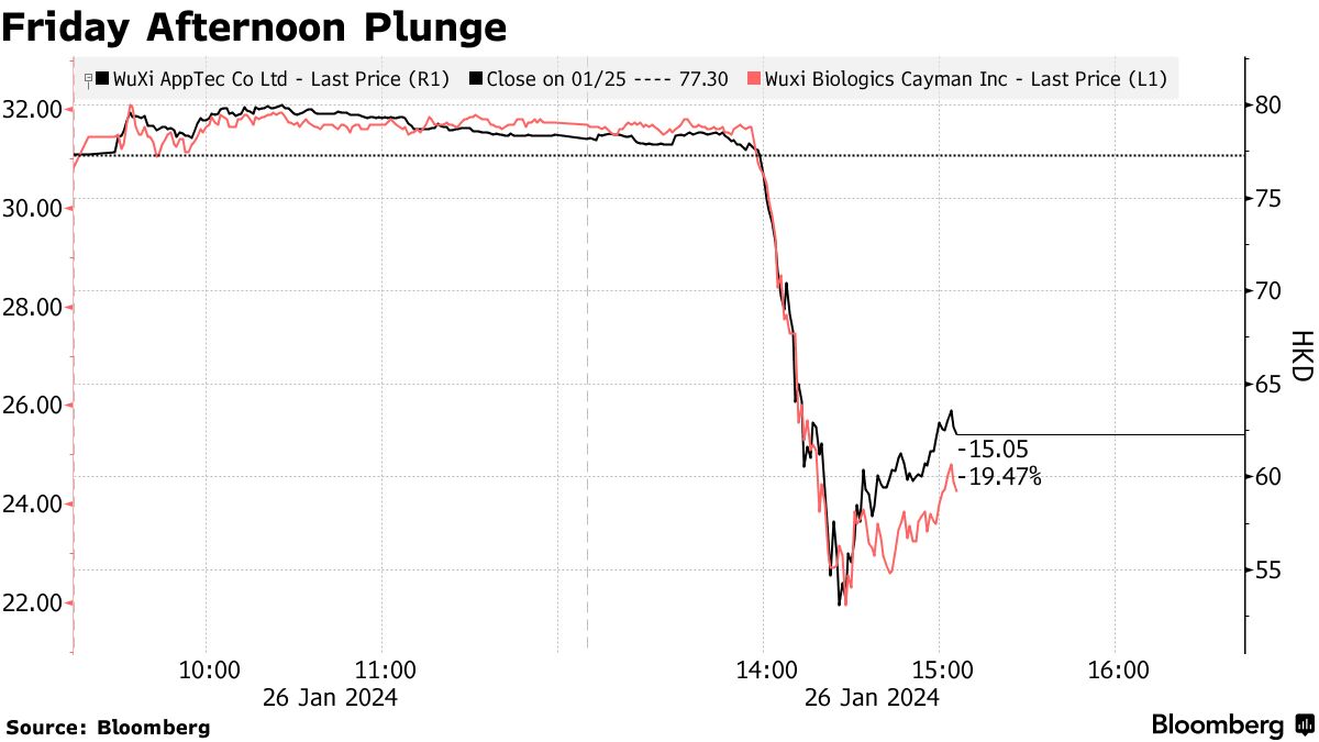 周五,无锡药明康德的股价一度下跌了32%,后来回落了约一半,而无锡生物制药开曼有限公司在香港的跌幅一度达到28%。它们的下跌帮助拖累了该市场的基准指数,一度下跌了2%。