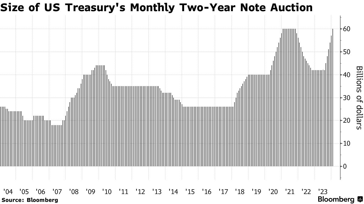 美国政府每月的两年期和五年期票据规模已经达到了峰值。周二和周三,售出了600亿美元的两年期票据和610亿美元的五年期票据。每个金额都达到了该期限有史以来的最高水平。任何一次美国国债拍卖的最大规模是2021年1月至10月间售出的62亿美元的七年期票据。