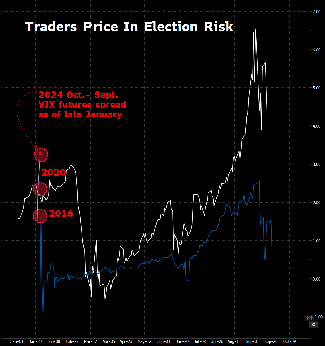 与前两次选举相比,VIX期货曲线在大选相关波动性“扭曲”的可能性更大,因为VIX指数的基数较低。周四,该指数在13.5左右徘徊,而2020年同期为14.6,2016年为24.2。