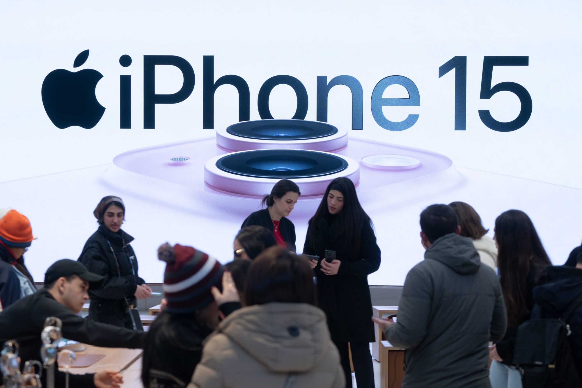 苹果 iPhone 15 智能手机标识在纽约第五大道的公司店铺。