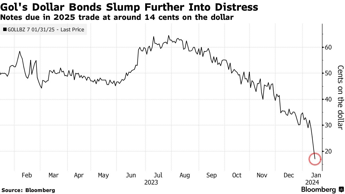 然而,总部位于圣保罗的Gol的债券已经跌至极度困境的水平。Lucror Analytics估计,到2025年到期的无担保美元债券的回收价值在15%至20%之间,大致与当前水平相当。预计股权持有者将在第11章破产保护程序中被大规模清算,其股价周五下跌了高达14.4%。
