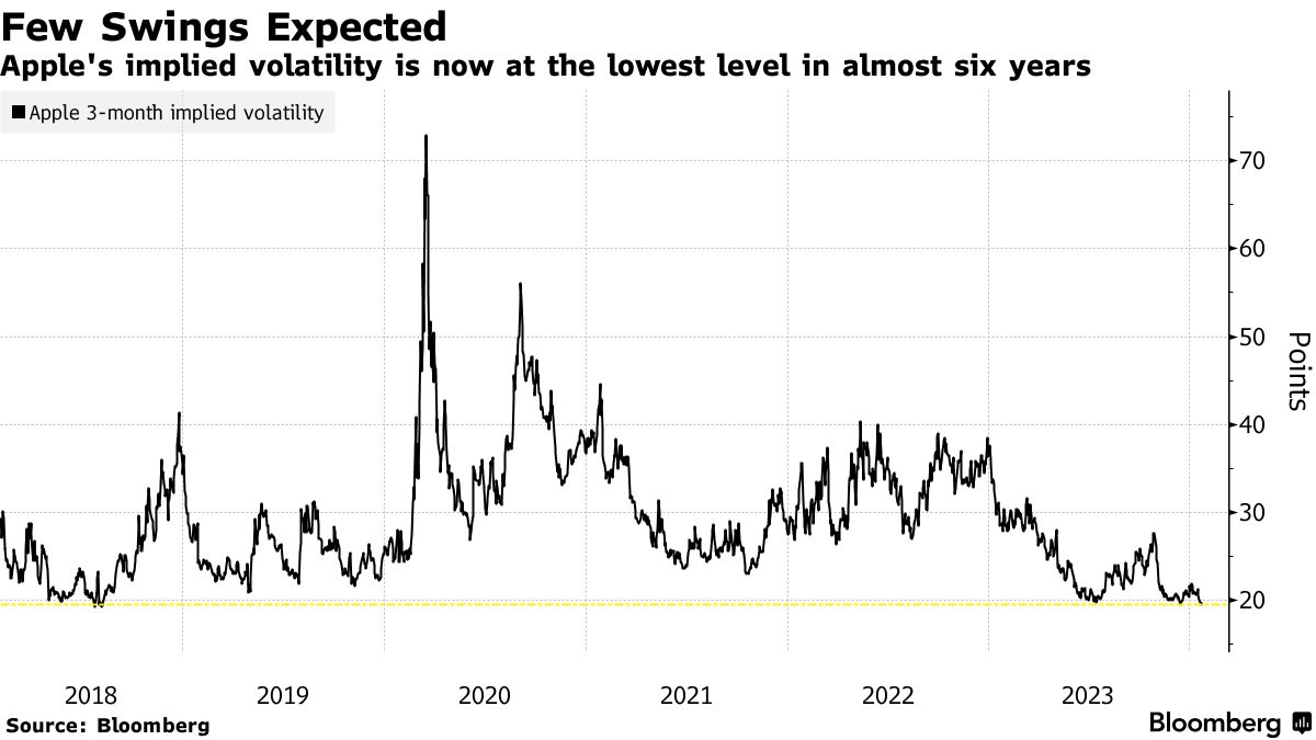 在未来三个月内,苹果的预期价格波动幅度接近六年来的最低水平。交易员预计,在发布财报后的第二天,该股票将出现3.3%的涨跌幅,这将是两年来盈利后股价波动幅度最小的情况之一。