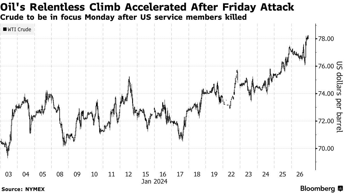 期货合约预示东京、香港和悉尼的基准股指可能会上涨。美国表示,伊朗支持的激进分子在叙利亚边境附近杀死了三名美国军人,这是以色列和哈马斯交战以来首次美国军人在敌方袭击下丧生。西德克萨斯中质原油周五上涨至每桶78美元,为去年11月以来最高,此前胡塞叛军袭击了一艘装载俄罗斯燃料的船只。