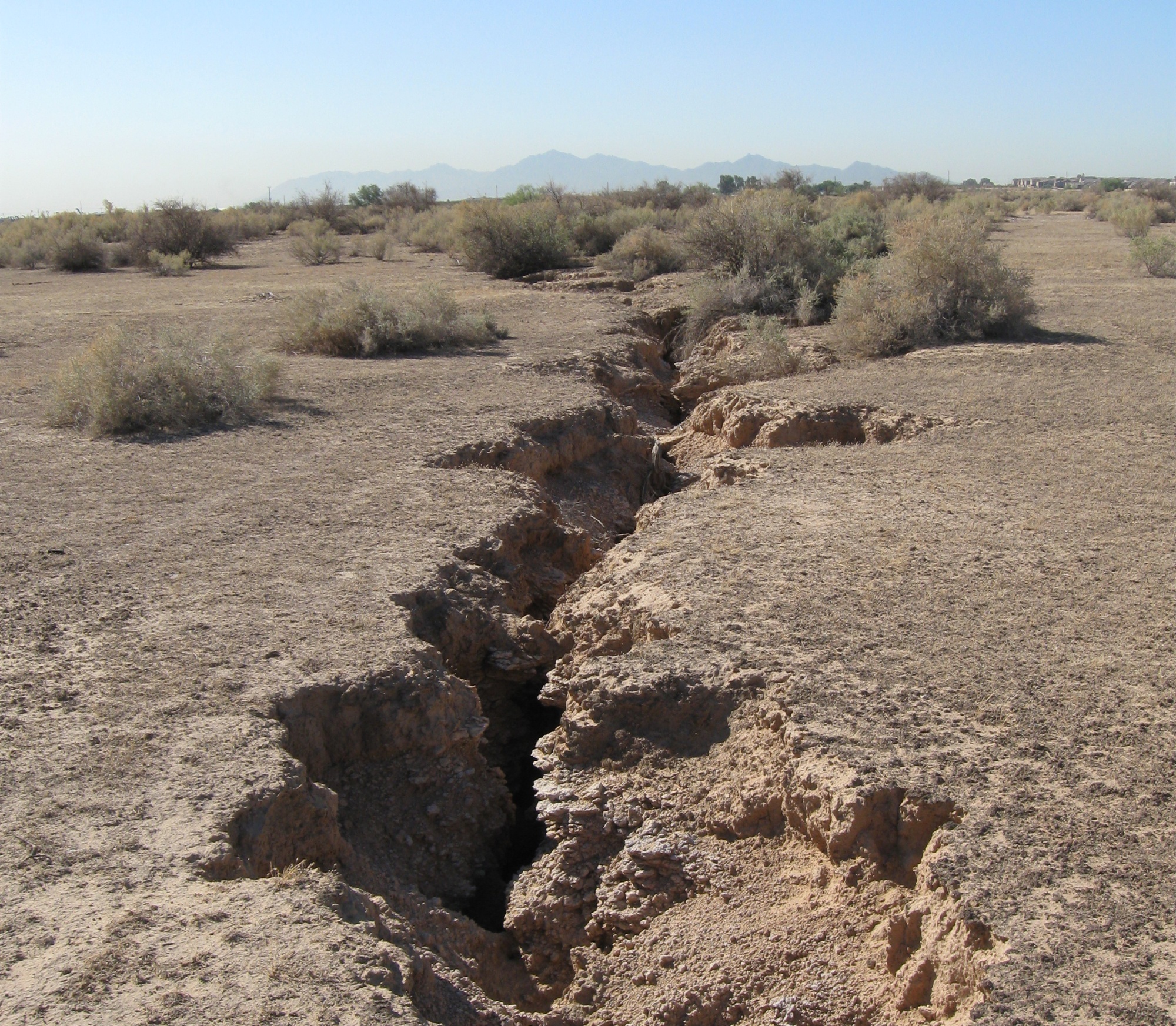 2008年卢克空军基地附近出现地裂缝。由于开发和其他活动扰乱了土地,一些裂缝在卫星图像上不可见,但仍然深达数百英尺,并存在于地表下,亚利桑那州水文地质学家布莱恩·康威说。摄影师:布莱恩·康威/亚利桑那州水资源部约瑟夫·库克是亚利桑那地质调查局的研究地质学家,他表示,一个大量消耗水资源的数据中心可能会导致新的裂缝产生。“数据中心可能不会受到影响,但可能会破坏道路和房屋,”他说。附近的卢克空军基地是第56战斗机联队的驻地,对当地经济和国家安全具有重要影响。
